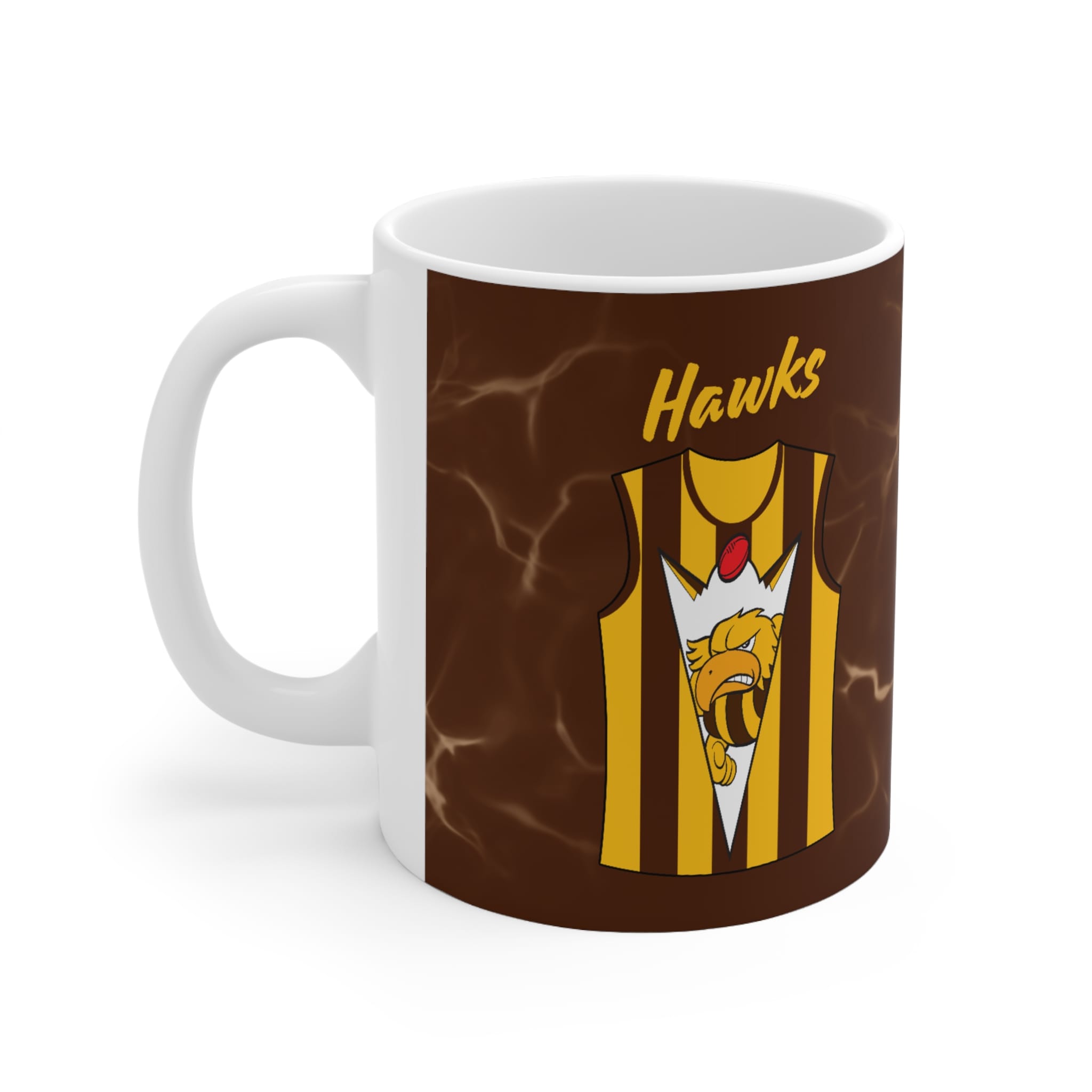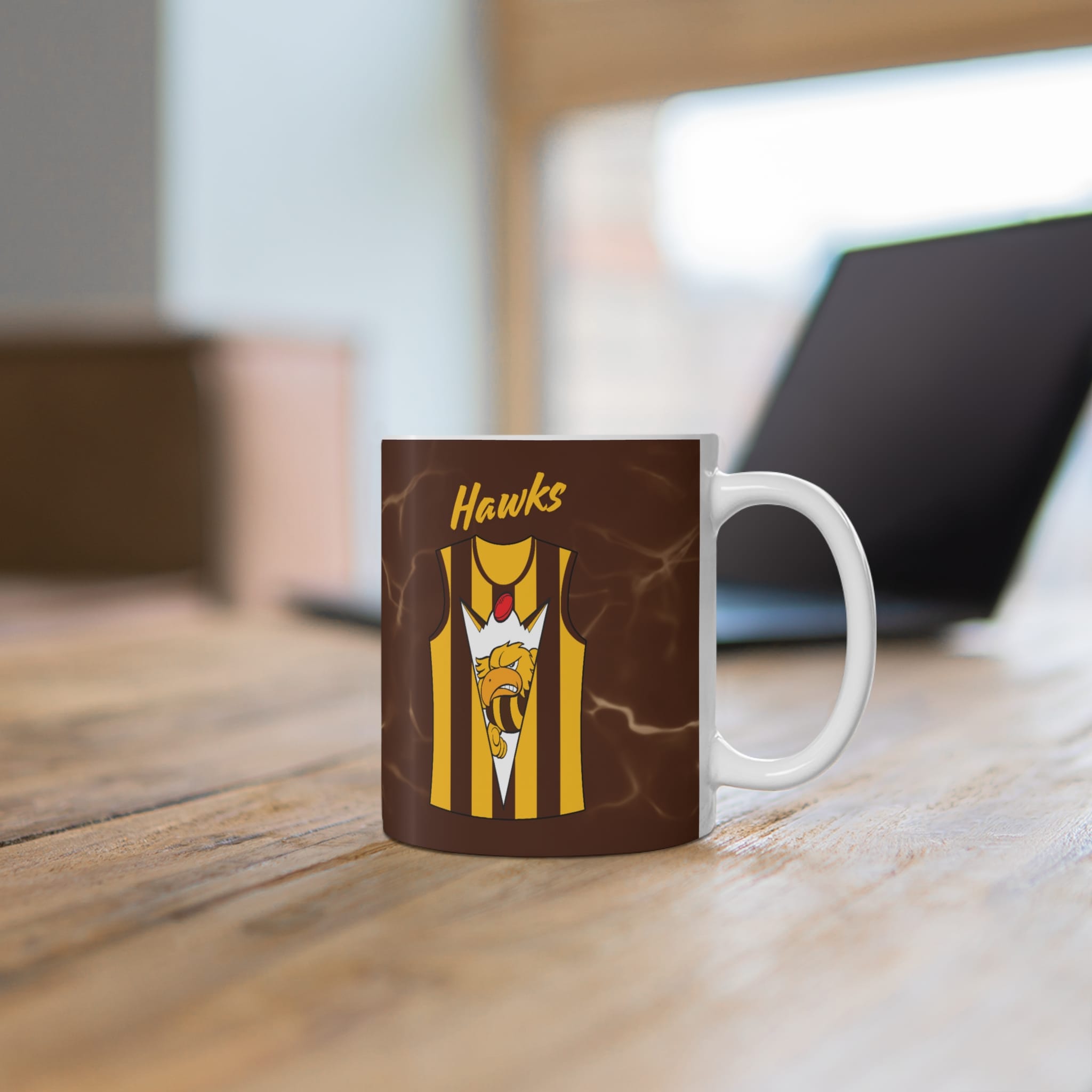 Enjoy every sip with The Hawks mug, designed for passionate Hawthorn Football fans. Featuring a tough and powerful Hawk mascot, this eye-catching design proudly showcases the team’s bold brown and gold jersey colours, making it a standout piece for any footy lover’s collection.