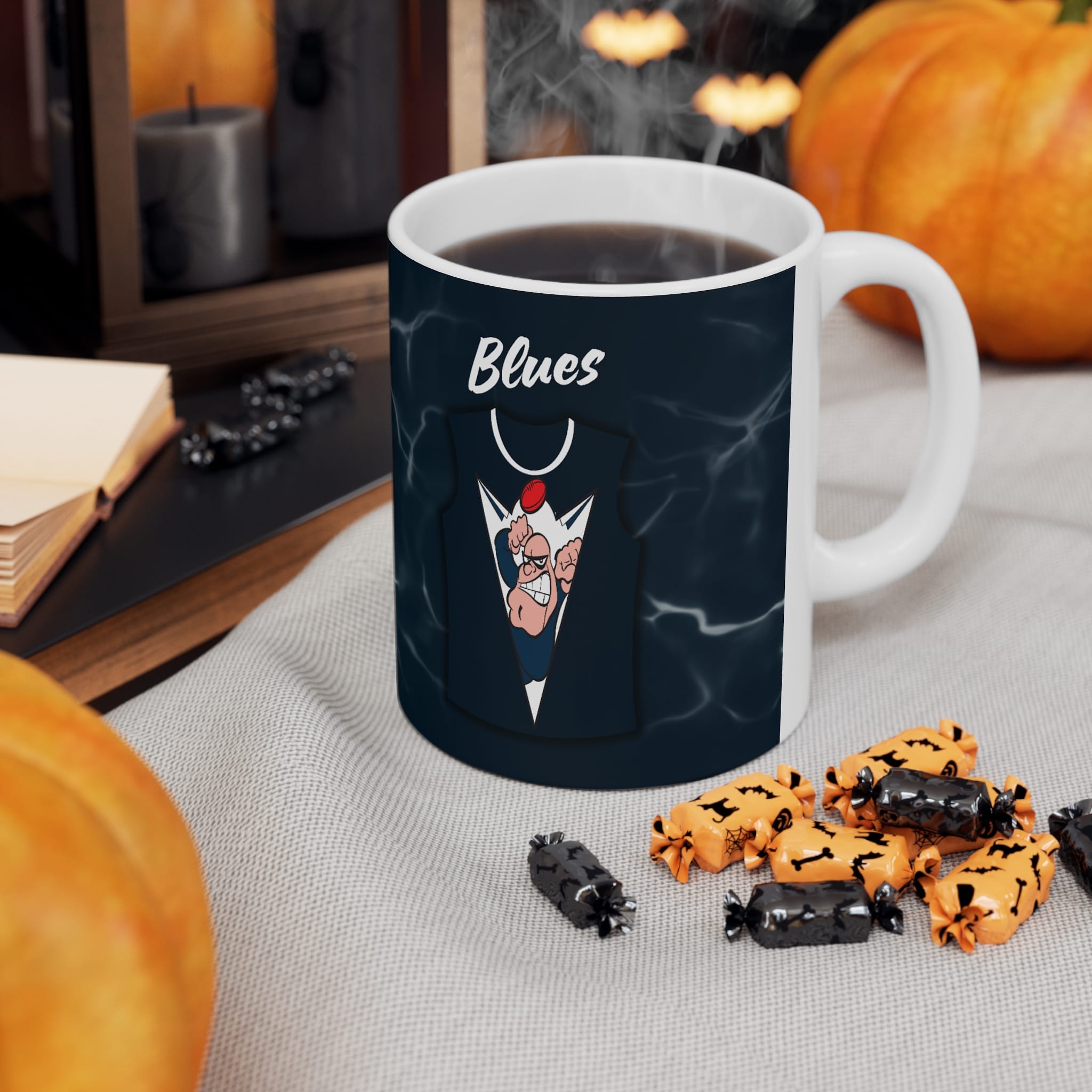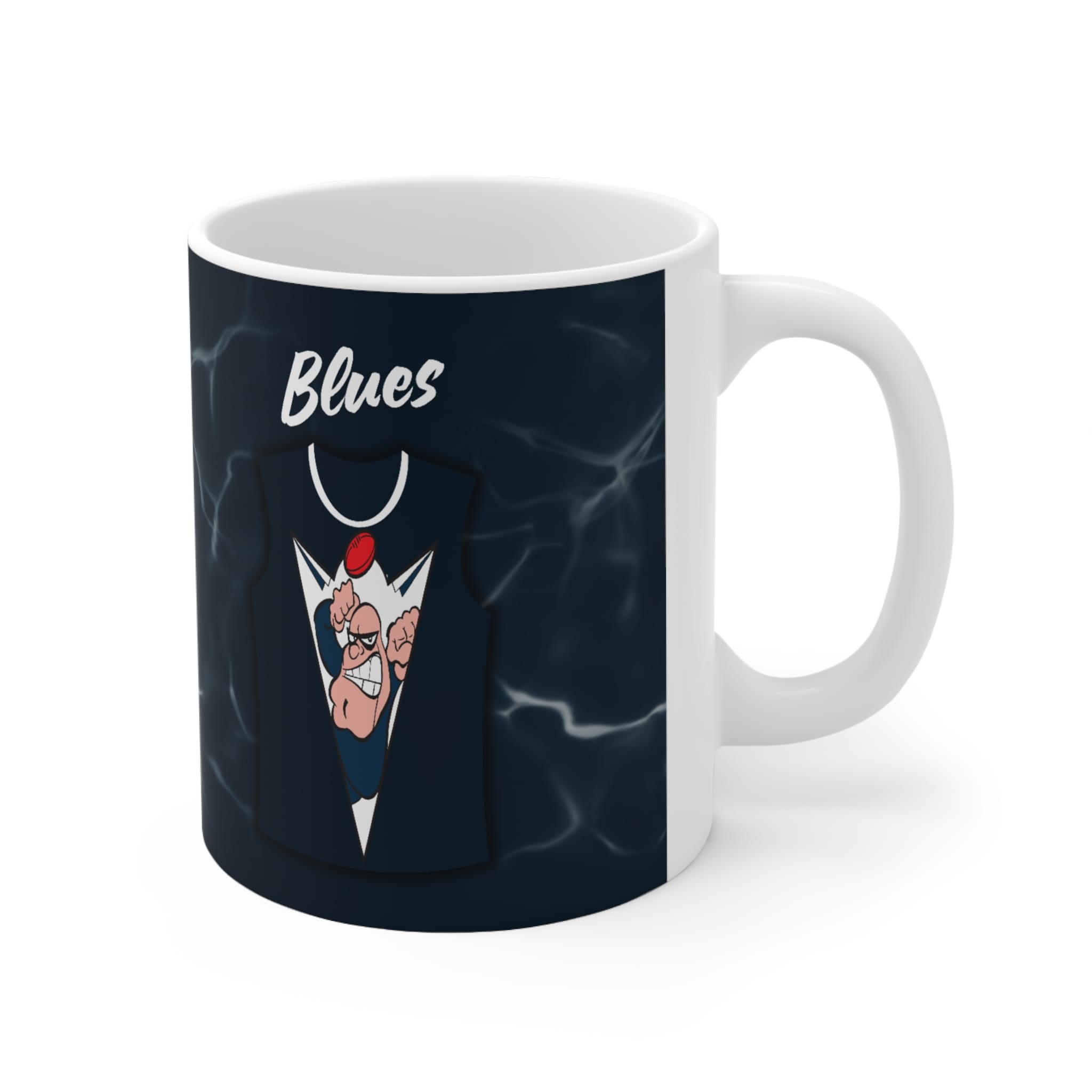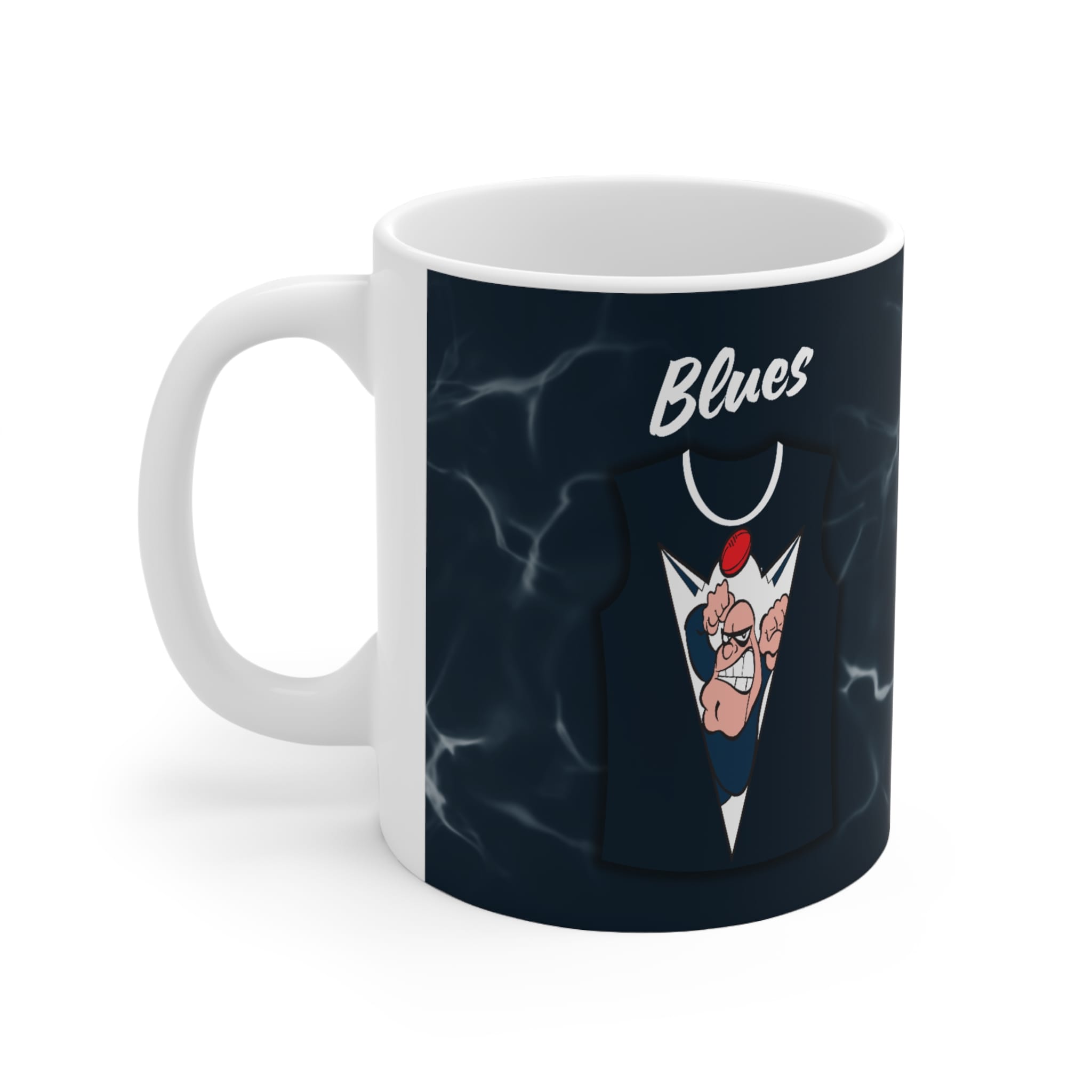 Enjoy every sip with The Navy Blues mug, designed for passionate Football fans. Featuring a strong and fearless mascot, this eye-catching design proudly displays the team’s iconic navy blue and white jersey colours, making it a standout piece for any footy lover’s collection.